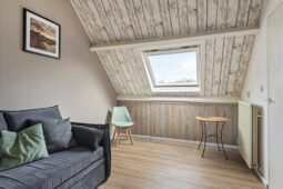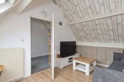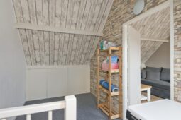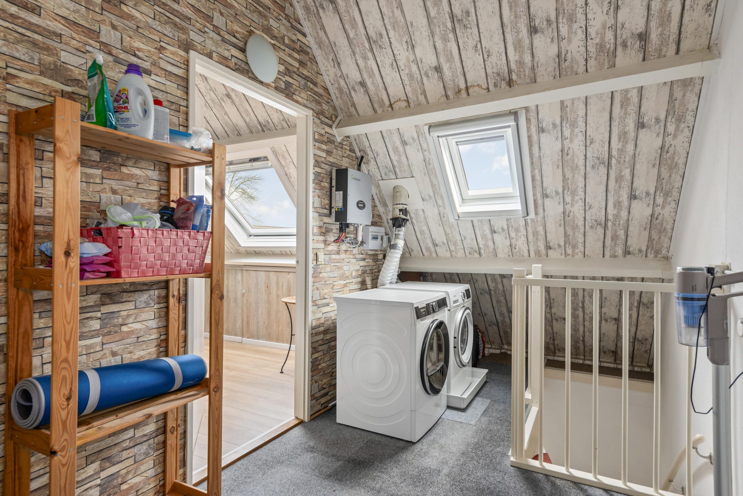 Overloop met bergruimte, aansluitingen voor wasapparatuur en de omvormer van de 12 zonnepanelen. Op deze verdieping bevindt zich de vierde slaapkamer met een groot dakraam en extra bergruimte.