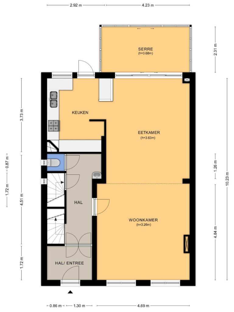 Vanuit de hal bereik je de zeer ruime en lichte woonkamer met hoge plafonds en een open haard. De woonkamer staat in open verbinding met de keuken en serre. Vanuit de lichte serre met hoge schuifdeuren is er toegang tot de sfeervolle achtertuin met achterom.