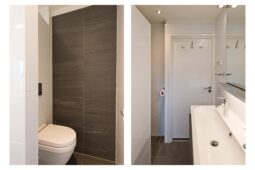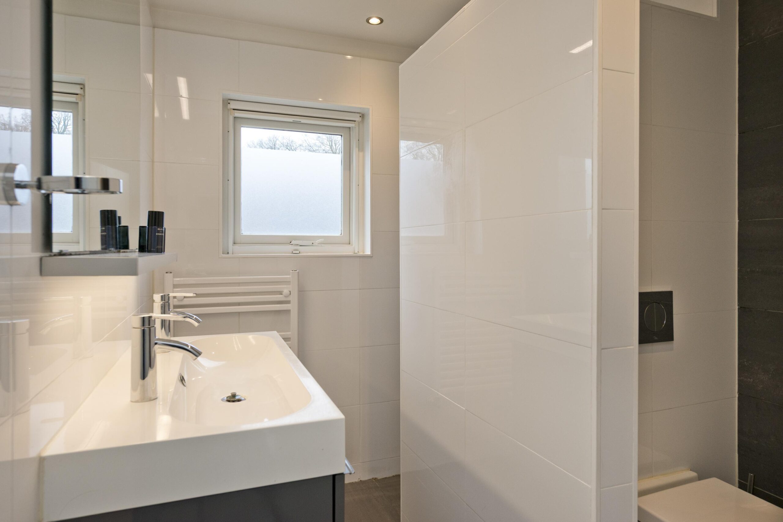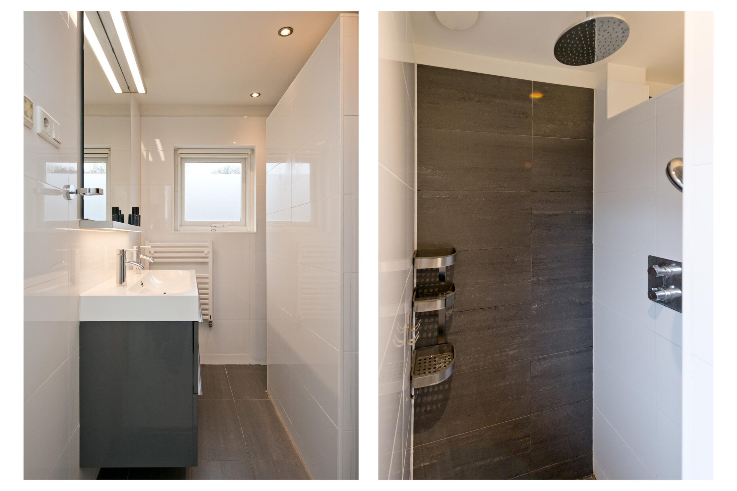 1e verdieping: overloop, 3 slaapkamers (waarvan 1 met balkon), en een nette badkamer met douche, tweede toilet en een dubbele wastafel.