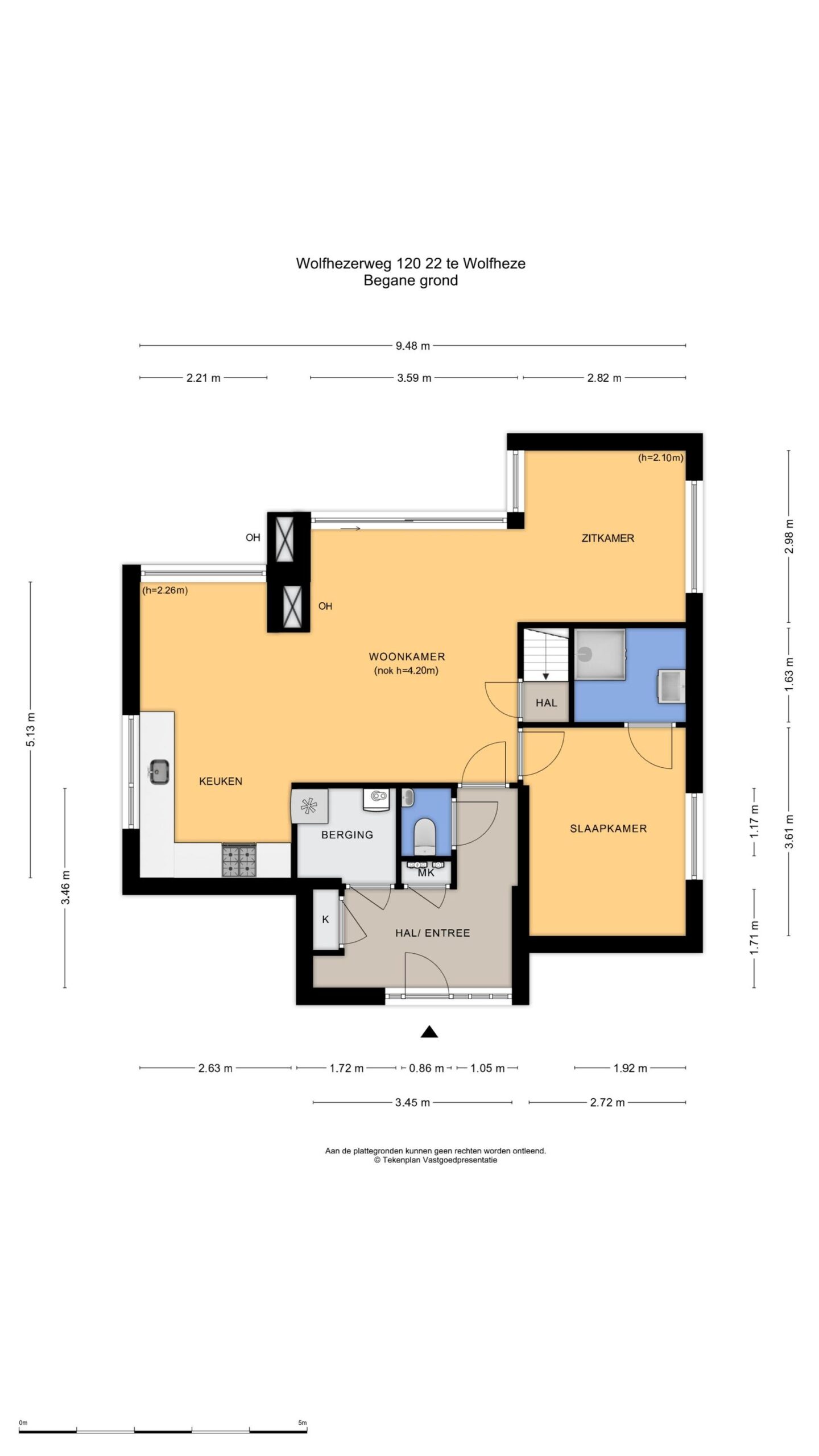 Begane grond: entree, hal met berging en stookruimte en toilet, doorloop naar de ruime, lichte woonkamer met schuifpui naar het zonnige terras. De woonkamer beschikt over een comfortabele haardpartij en open keuken. Verder is de 2e slaapkamer bij de woonkamer getrokken, deze is eventueel indien wenselijk, weer als slaapkamer om te bouwen. Op deze verdieping treft u verder de ouderslaapkamer en de badkamer met wastafel en douche. Vanuit de berging in de hal en vanuit de woonkamer kunt u twee ruime bergzolders bereiken.