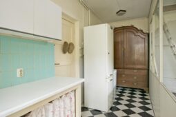 De keuken is bereikbaar vanuit de hal en biedt eveneens toegang tot de ruime garage. Deze garage beschikt over openslaande deuren naar de oprit en een grote vliering met veel bergruimte — ideaal voor hobby, opslag of eventueel werkruimte aan huis.